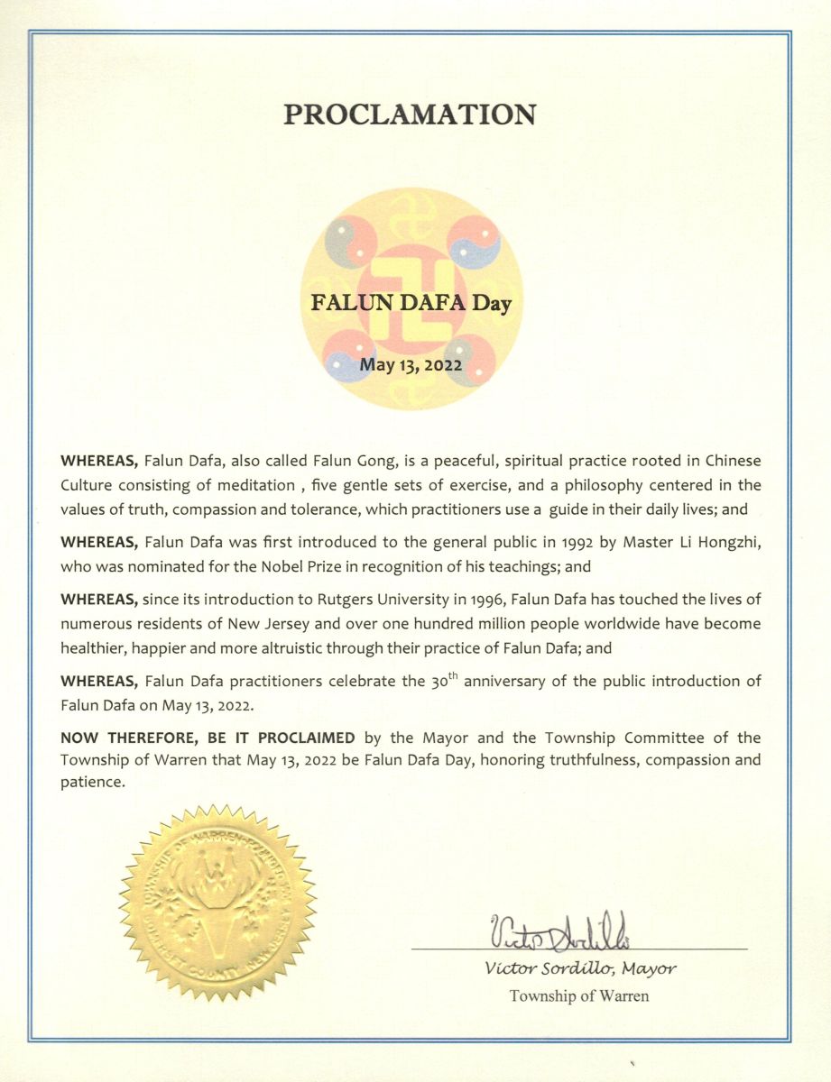 因此,现在由市长和委员会宣布华伦市定于二零二二年五月十三日为法轮大法日,致敬真、善、忍。