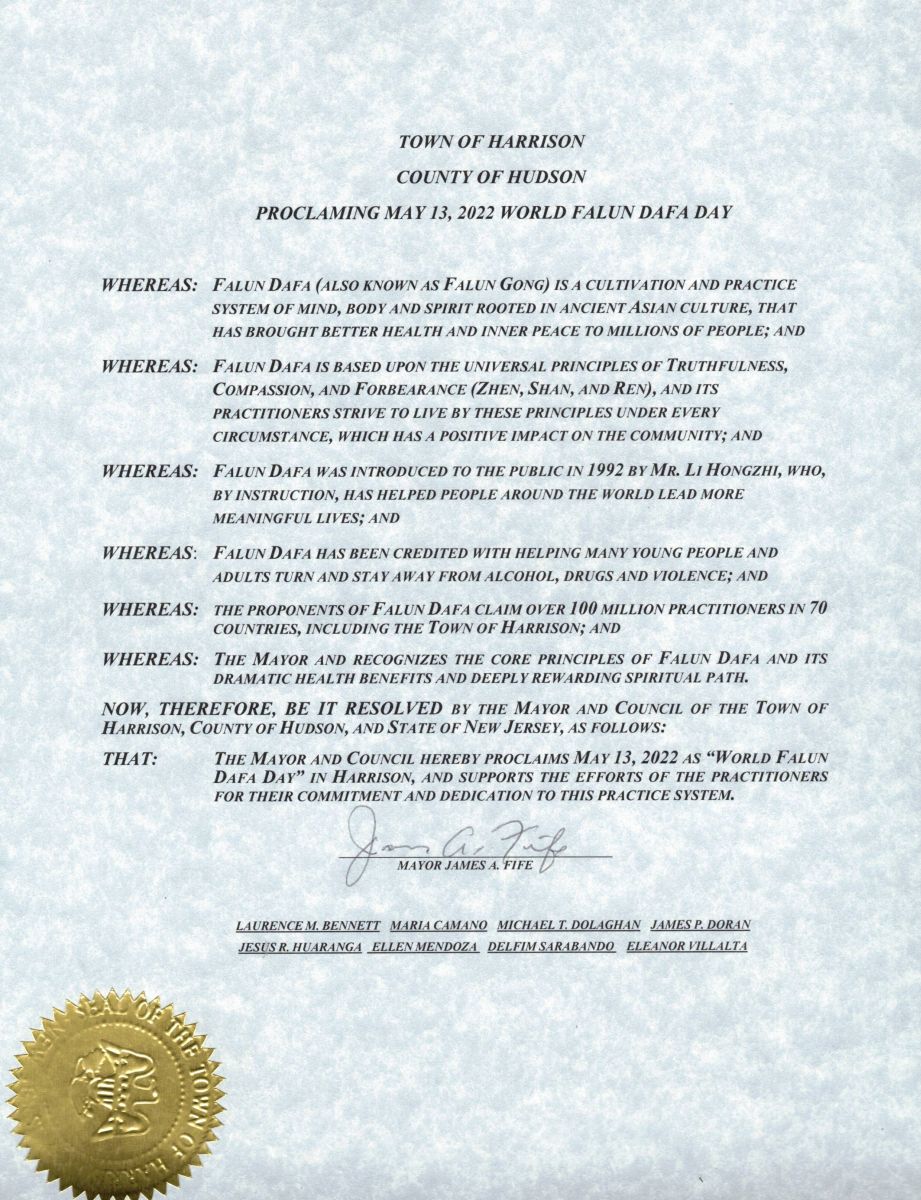市长和市议会在此宣布二零二二年五月十三日为哈里森的“世界法轮大法日”,并支持法轮功学员对这一修炼体系的承诺和奉献。