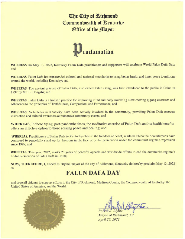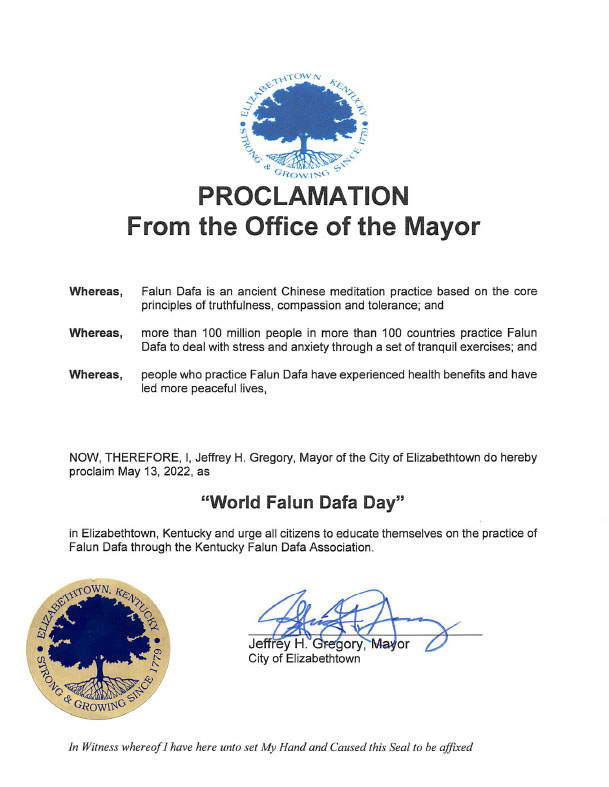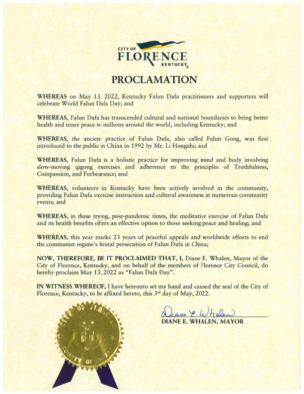 【明慧网二零二二年五月十六日】二零二二年五月十三日,在法轮大法洪传世界三十周年纪念日来临之际,美国肯塔基州的佛罗伦萨市、梅菲尔德市、伊丽莎白市和里士满市的市长及市政厅颁发褒奖令,宣布二零二二年五月十三日为各个城市的“法轮大法日”,庆祝世界法轮大法日。他们特别褒奖法轮功学员服务于社区,在瘟疫中给当地居民带来一健康之道,要求当地的居民了解法轮功,一起结束在中国的对法轮功的迫害