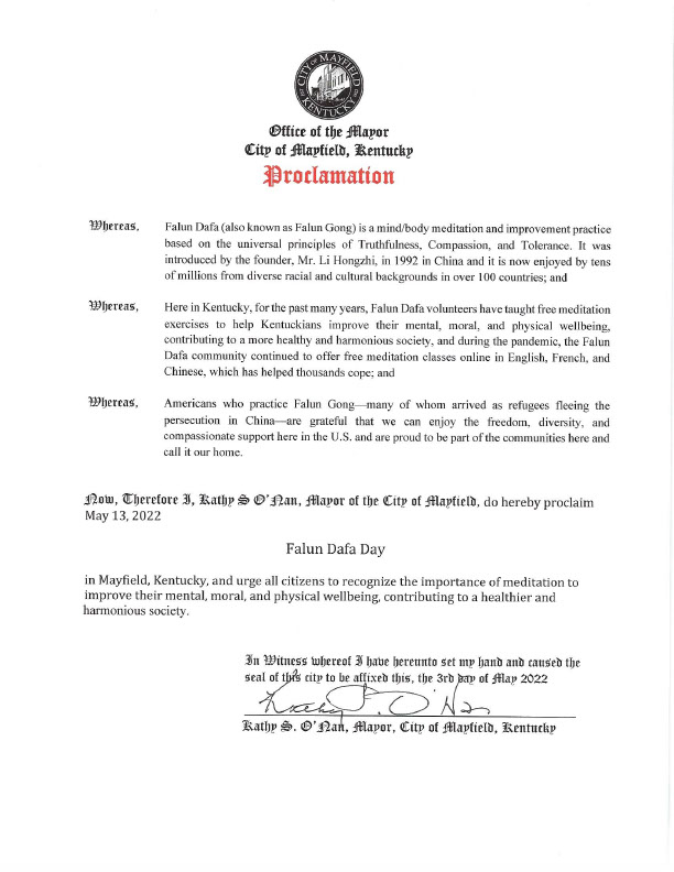 因此,我,凯瑟·欧南,作为梅菲尔德市长,郑重宣布,二零二二年五月十三日为梅菲尔德市“法轮大法日”。