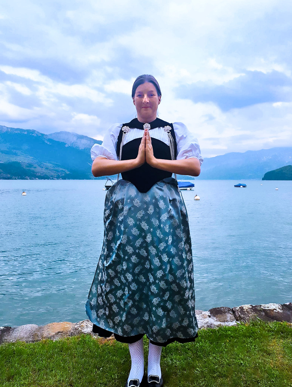 ![]() 图2:二零二二年五月十三日,西蒙娜身着瑞士传统节庆服装,感恩师尊将大法,将希望传于世间 |
