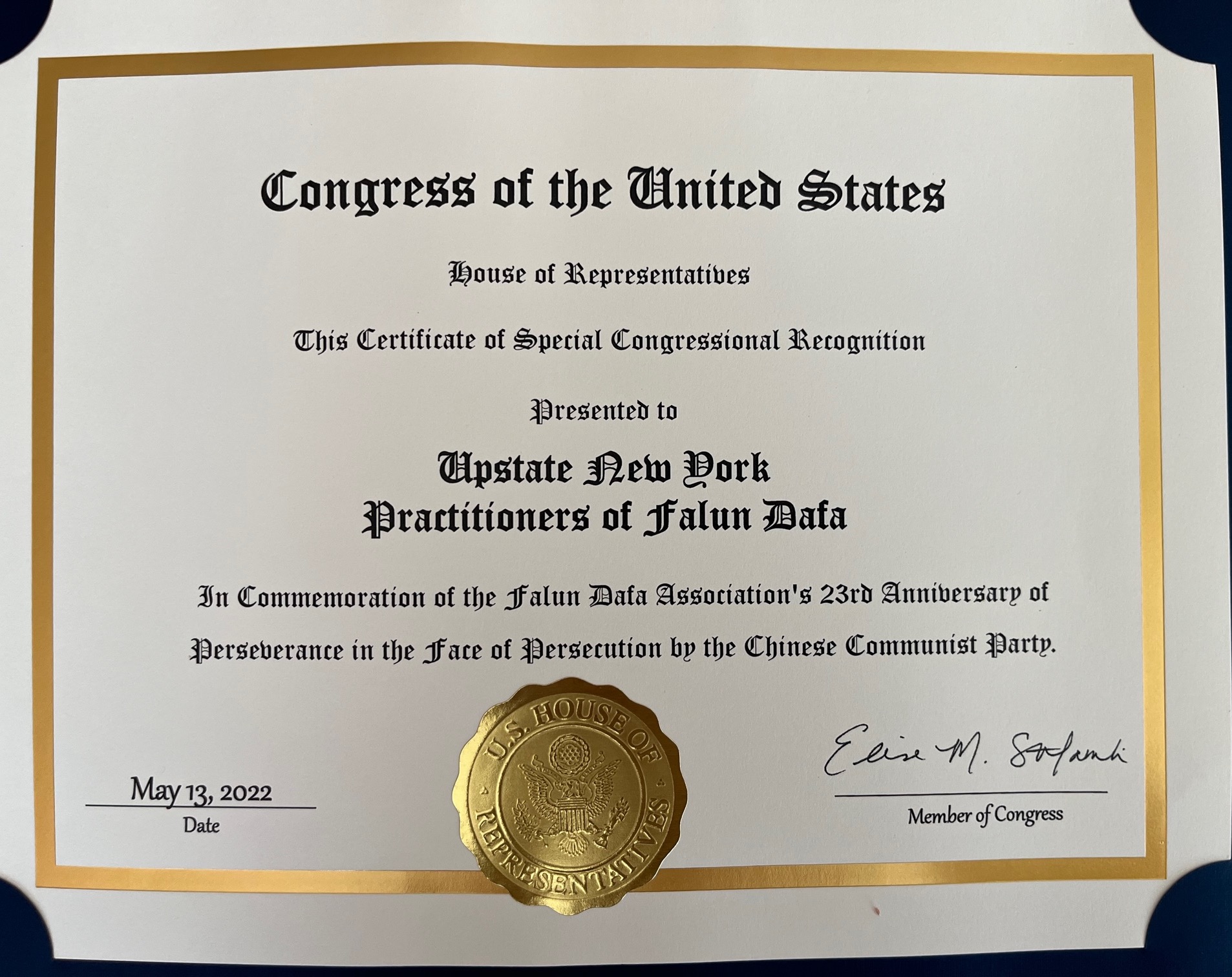 ![]() 图2:纽约州第二十一选区联邦众议员、众议院共和党会议主席埃莉斯·斯特凡尼克(Elise Stefanik)向纽约上州法轮大法修炼者颁发了美国国会特别褒奖令,“以纪念法轮大法团体在中共迫害下坚守二十三周年”。 |