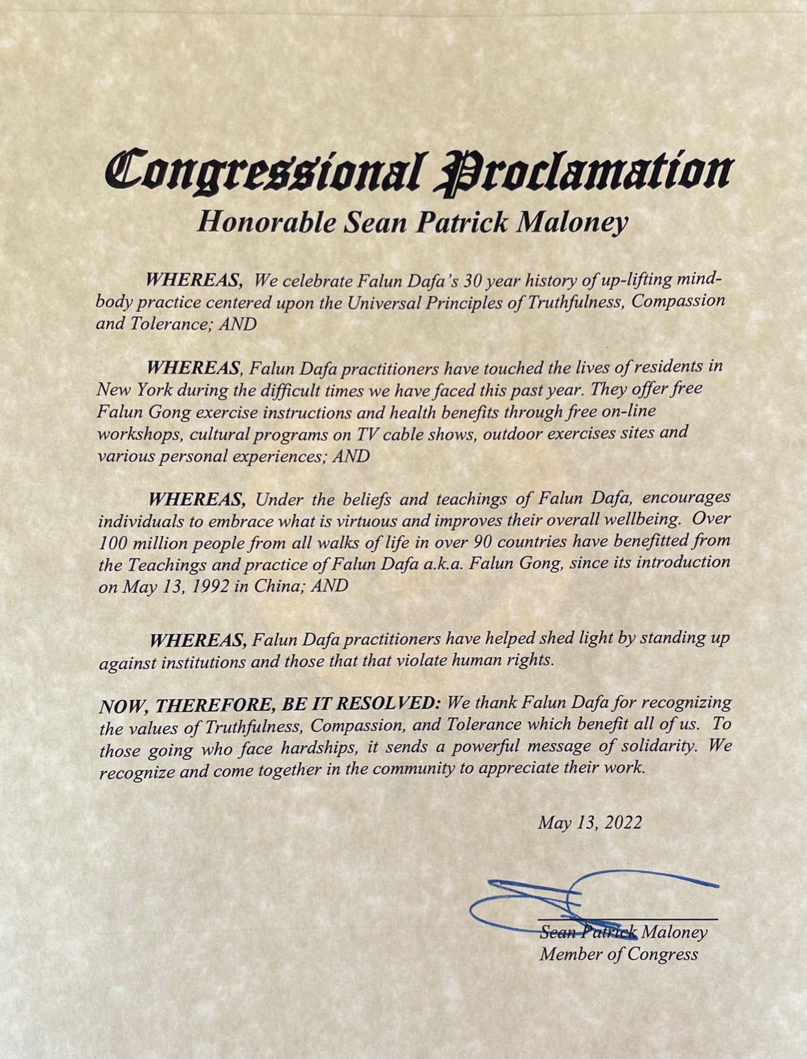 ![]() 图3:纽约州第十八选区联邦众议员、民主党国会竞选委员会主席肖恩·帕特里克·马洛尼(Sean Patrick Maloney)在褒奖令中写道:“我们感谢法轮大法倡导造福于所有人的真、善、忍价值观,对于那些身处艰辛中的人来说,他发出了强大的团结信息,我们认可并在社区中团结起来,赞赏他们的工作。” |