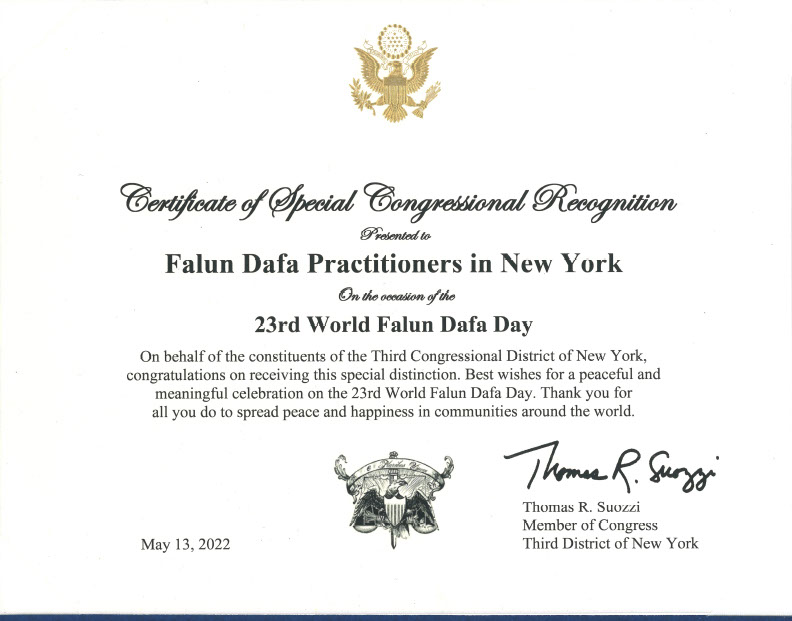 ![]() 图6:纽约州第三选区联邦众议员托马斯·苏奥齐(Thomas R. Suozzi)说,“我代表纽约第三国会选区的选民,祝贺您获得这一特殊荣誉。祝贺第二十三届世界法轮大法日和平而有意义的庆祝活动。感谢您为世界各地的社区传播和平与幸福所做的一切。” |