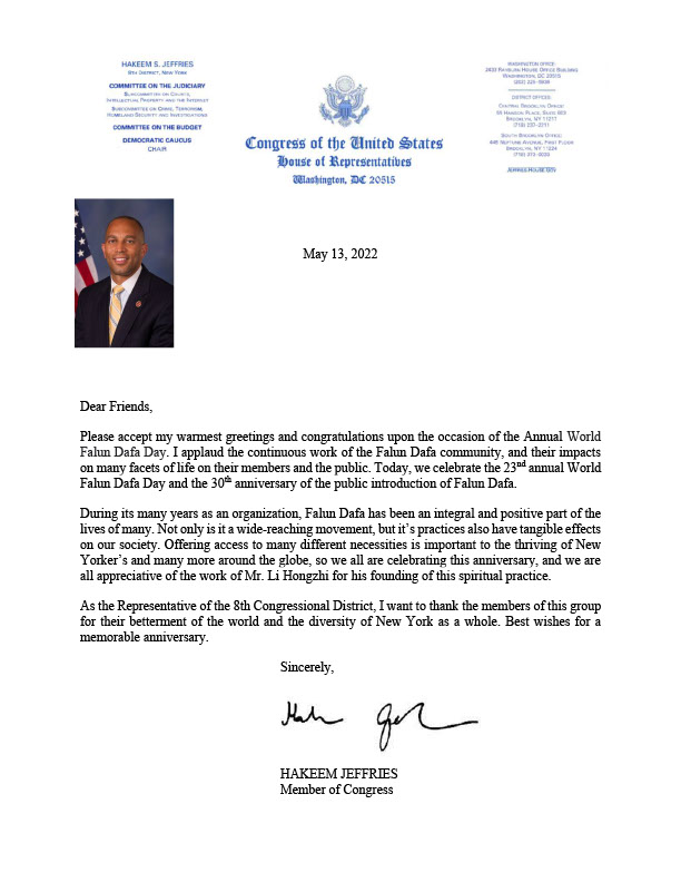 ![]() 图8:纽约州第八选区联邦众议员哈基姆·杰弗里斯(Hakeem Jeffries)发来贺信,祝贺世界法轮大法日。 |