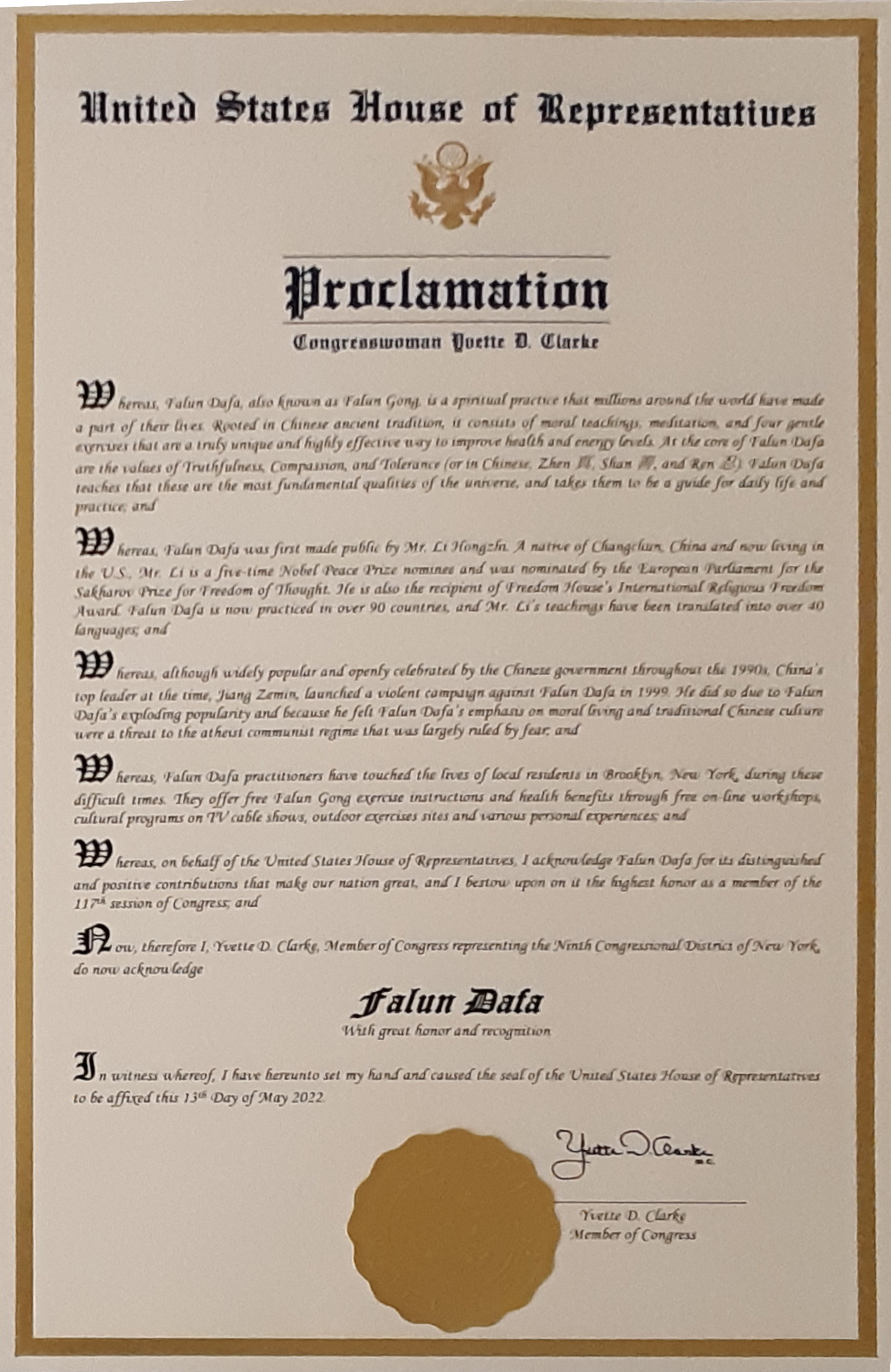 纽约州第九选区联邦众议员伊薇特·克拉克(Yvette D. Clarke)在褒奖令中说,“我代表美国众议院,感谢法轮大法为使我们的国家伟大而做出的非凡而积极的贡献,并授予他作为第117届国会议员的最高荣誉。我现在代表纽约州议会第九选区的国会议员,授予法轮大法最高荣誉。”