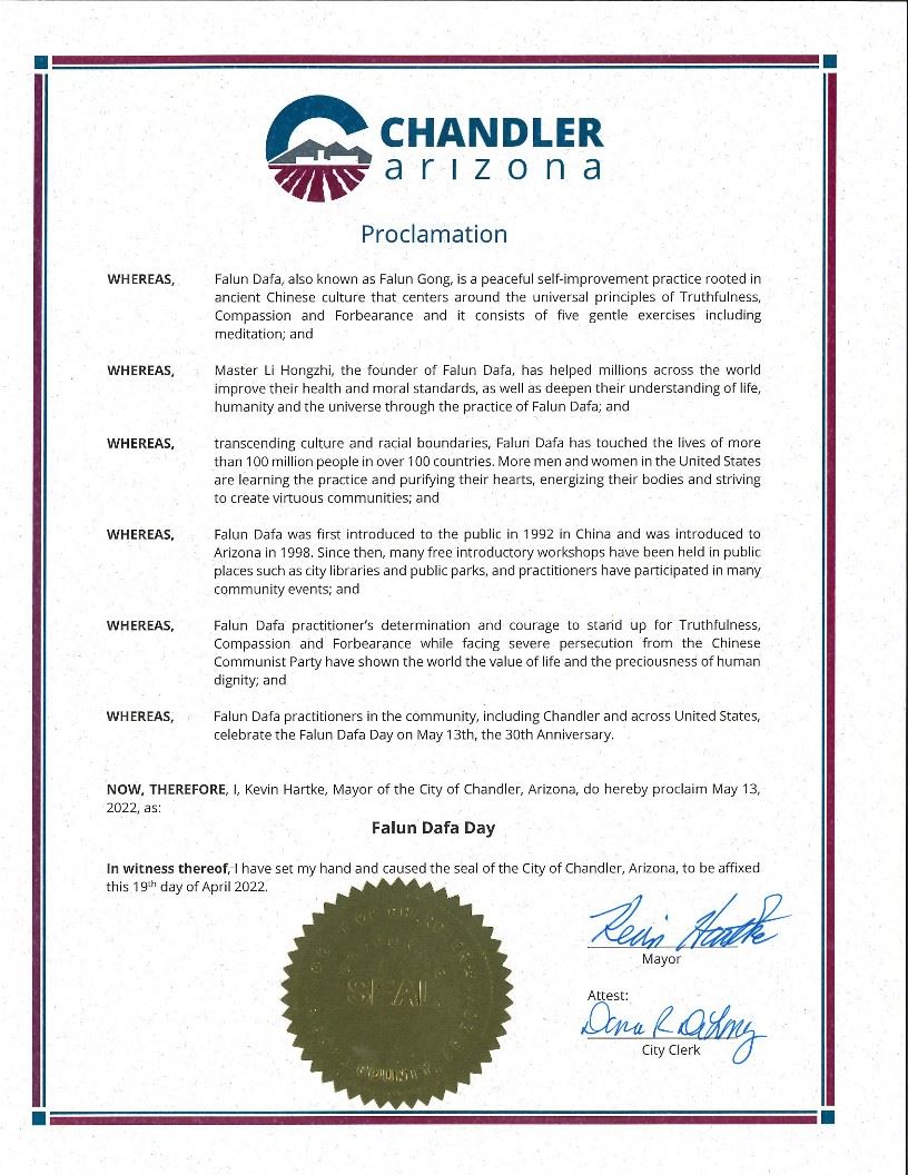 因此,我,凯文•哈特克(Kevin Hartke),作为亚利桑那州钱德勒市市长,在此宣布二零二二年五月十三日为法轮大法日。