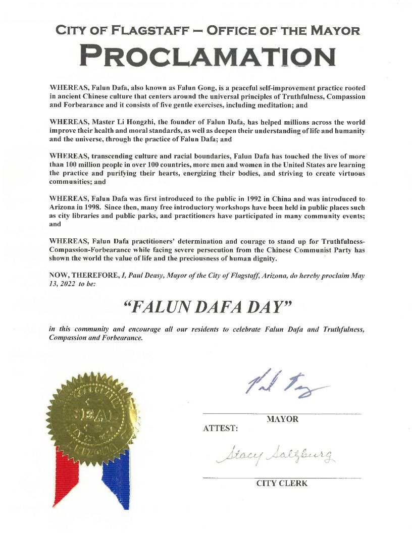 现在,因此,我,保罗•迪西(Paul Deasy),作为亚利桑那州旗杆市市长,在此宣布二零二二年五月十三日为“法轮大法日”。