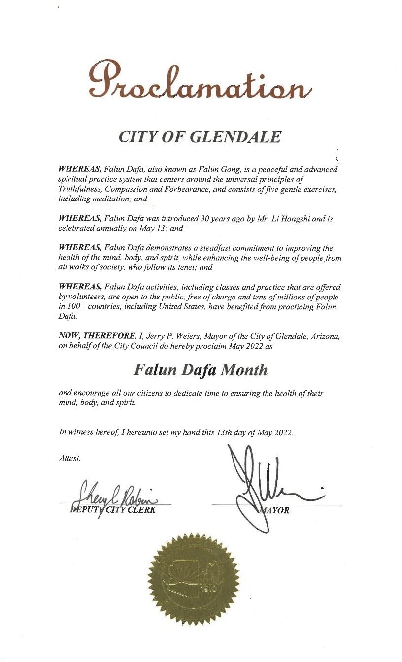 现在,因此,我,杰瑞•威尔士(Jerry Weiers),作为亚利桑那州格兰岱尔市市长,代表市议会,在此宣布二零二二年五月为“法轮大法月”。