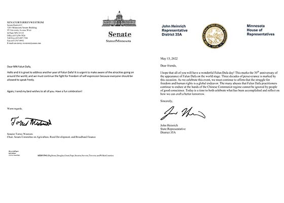 美国明尼苏达州多位政界、学术界人士及民众,发来贺信或邮件,庆祝5月13日世界法轮大法日,呼吁尽快结束中共对法轮大法的残酷迫害。