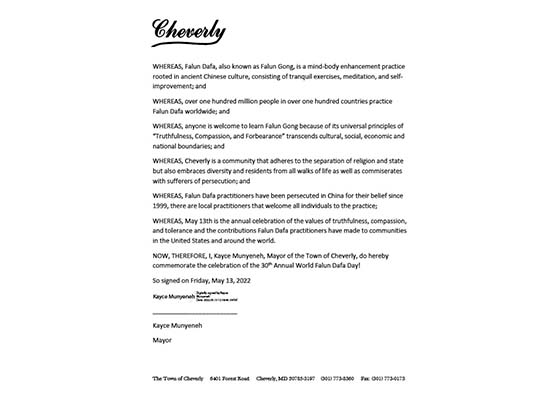 美国马里兰州切弗里市长 凯斯·穆彦内颁发褒奖,纪念第二十三届世界法轮大法日。