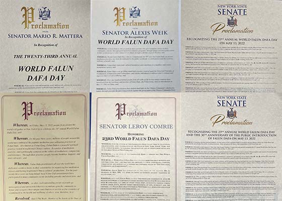 继纽约州参议院通过第2278号决议案,庆祝世界法轮大法日暨法轮大法弘传三十周年;六位州参议员单独发布褒奖令,颂扬法轮大法。