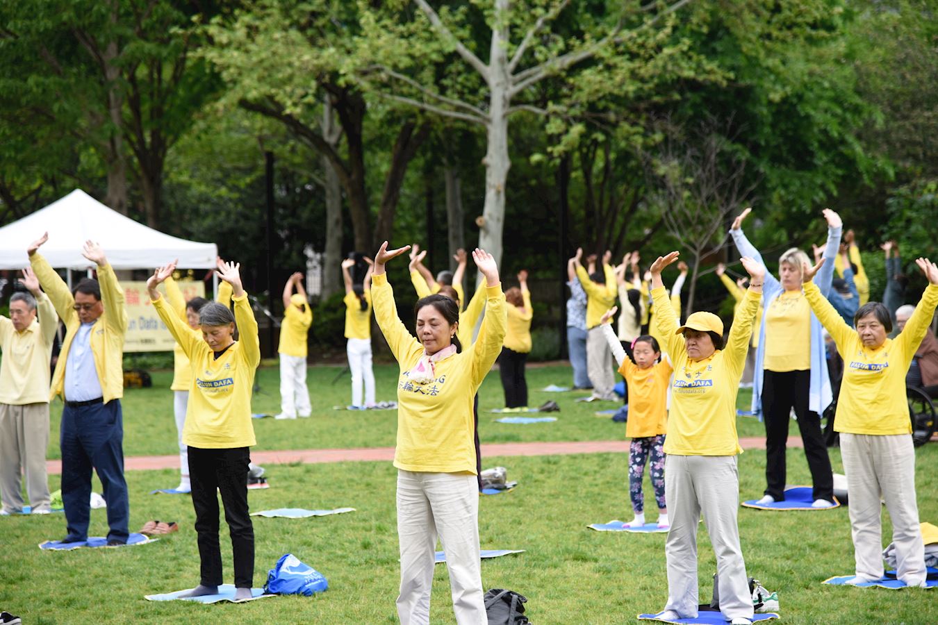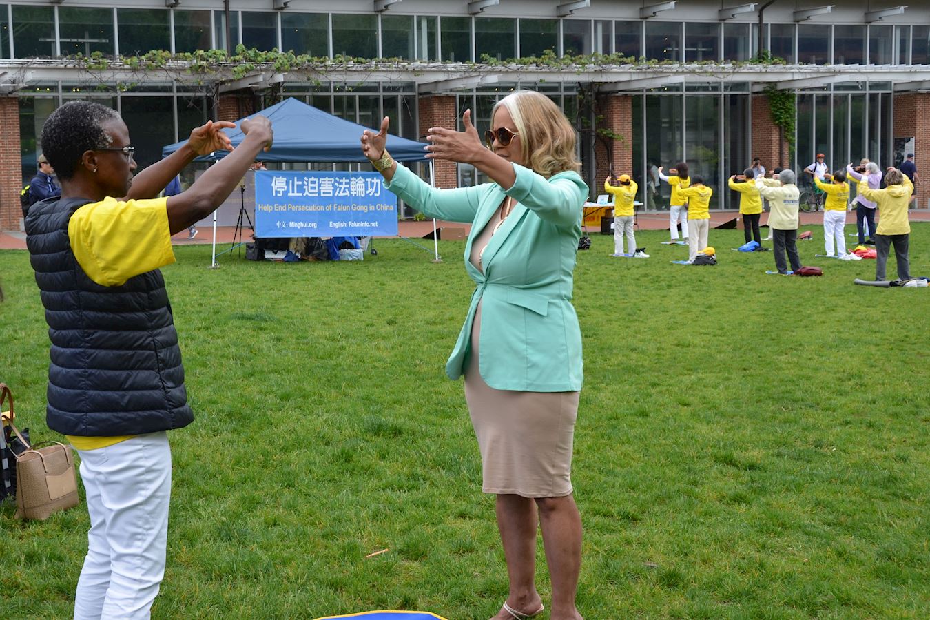图8:卡门·索萨(Carmen v Sousa)女士(右)还在现场学炼了法轮功,并参加了庆祝活动。