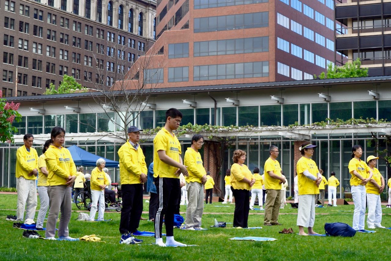 '图1~3:五月十五日,大费城地区部份法轮功学员在费城著名历史景点自由钟独立广场举办了盛大的集会,庆祝法轮大法洪传世界三十周年。'