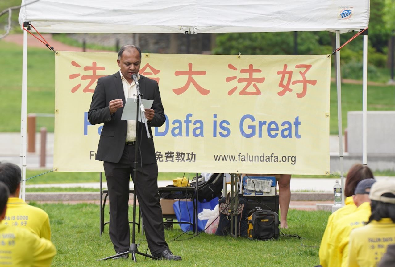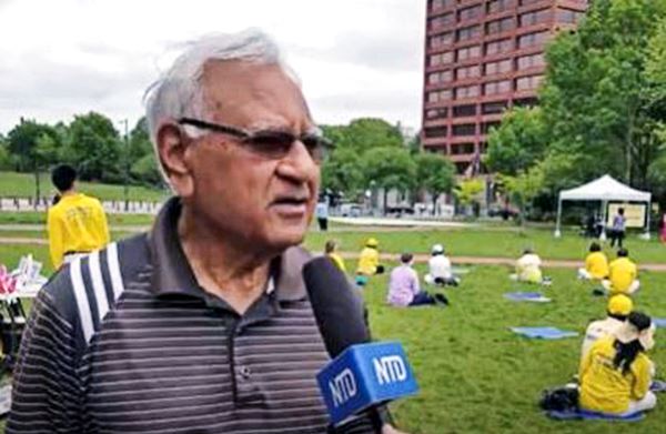图9:到自由钟参观的游客根德拉·布哈拉(Gendndra Bujara)医生表达了对法轮功的支持。