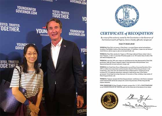 美国弗吉尼亚州新上任州长格伦·扬金正式表彰法轮大法,宣布二零二二年五月十三日为弗吉尼亚州的法轮大法日。