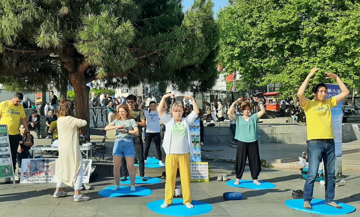五月十三日,法轮功学员首先前往中共驻伊斯坦布尔领馆,抗议中共对法轮功长达二十二年的迫害。当天,许多路人经过时停下脚步,观看法轮功学员炼功,了解法轮功真相。