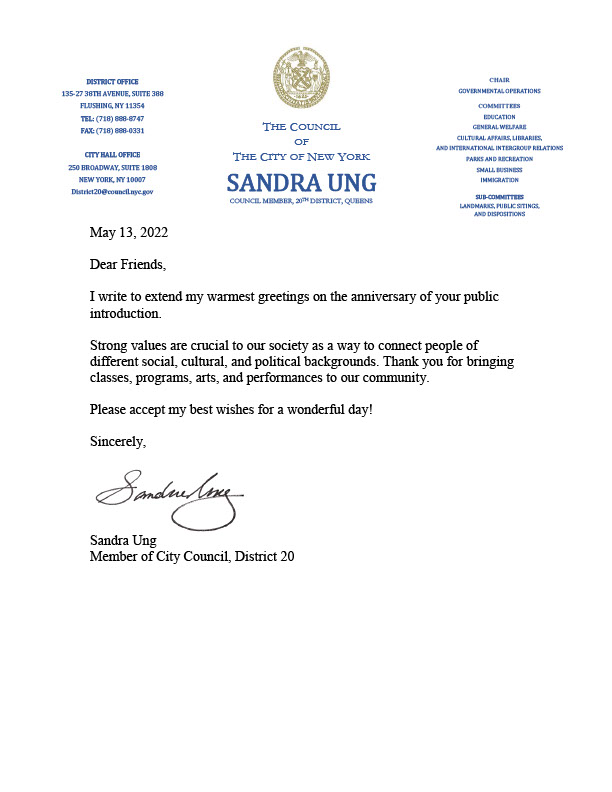 作为世界性的皇后区,我们明白我们的多样性是使皇后区继续伟大的原因。我很自豪地向法轮大法的修炼者们祝贺并致敬,他们不仅为我们的文化多样性做出了贡献,而且还帮助提升了纽约同胞们的精神面貌以应对新冠病毒大流行带来的压力挑战。