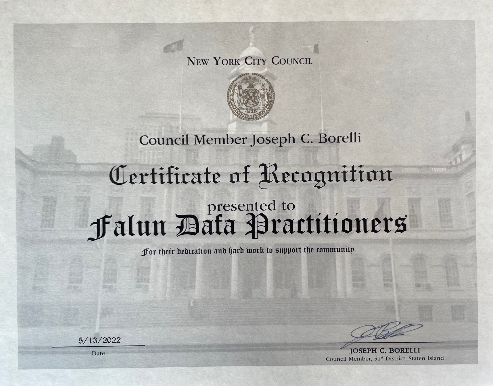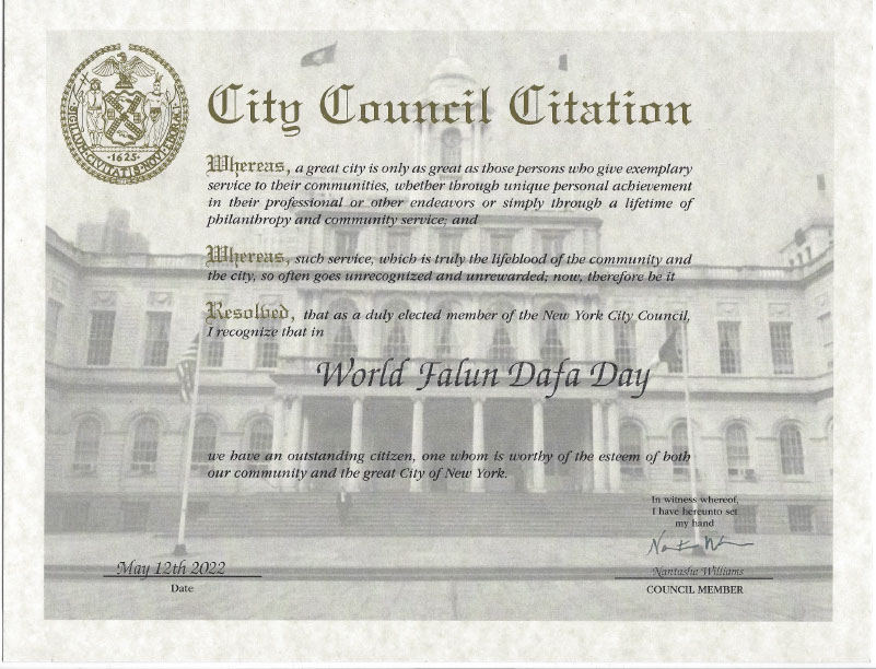 纽约市四位市议员发贺信褒奖,祝贺大法弘传三十周年,并感谢大法给社区带来的福祉。