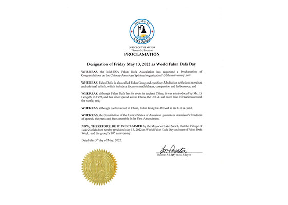 伊利诺伊州苏黎世湖市宣布法轮大法周