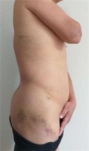 '右侧胸部、臀部、右手背外侧软组织挫伤'