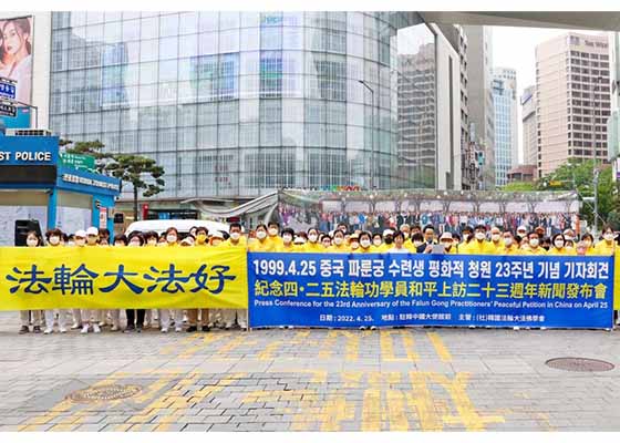 二十五日上午,韩国法轮功学员在位于首尔明洞的中国驻韩国大使馆附近,举行新闻发布会,纪念“四·二五”和平请愿二十三周年。