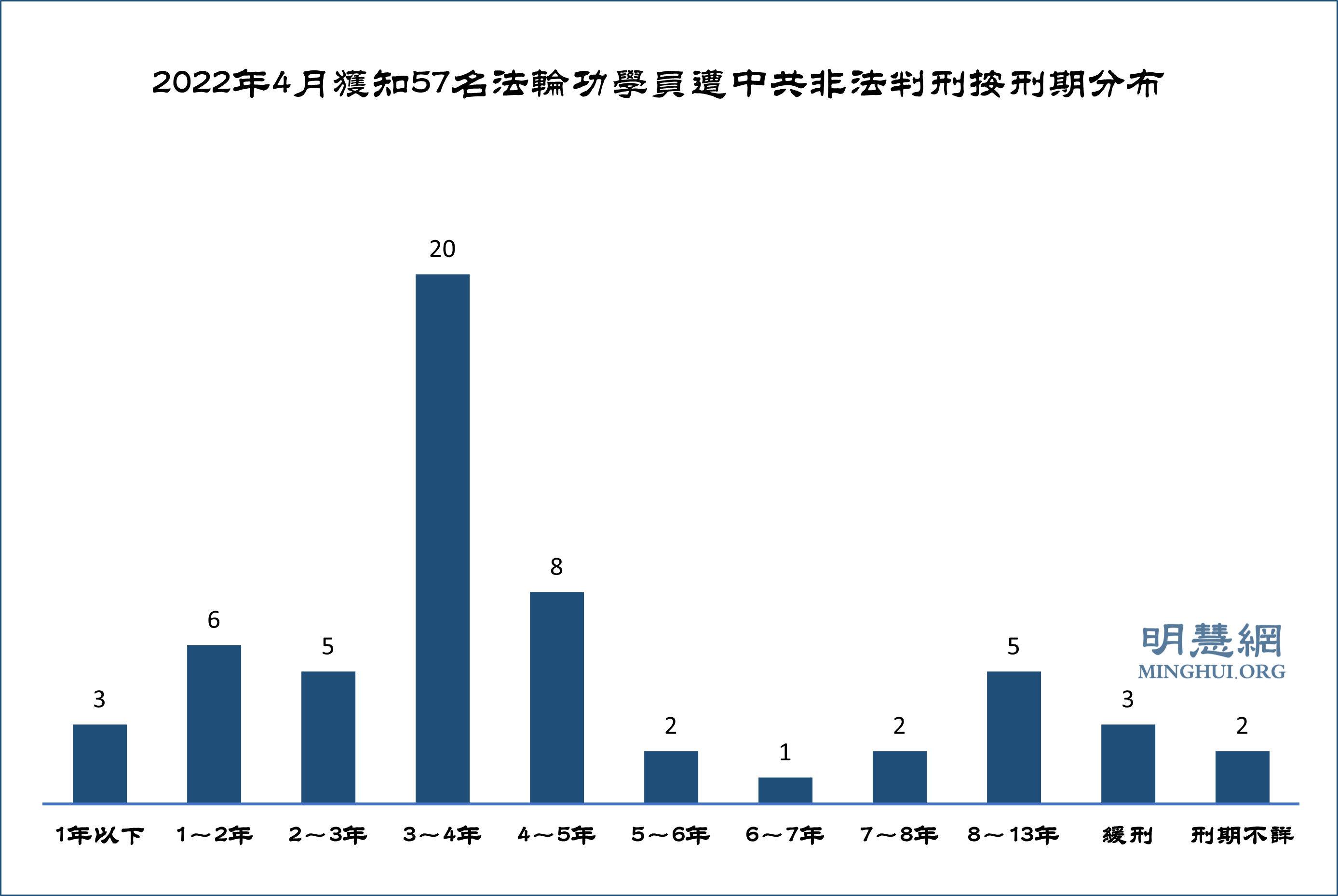 ![]() 图1:2022年4月获知57名法轮功学员遭中共非法判刑按刑期分布 注:1~2年(1年或1年以上,2年以下,余下类推) |