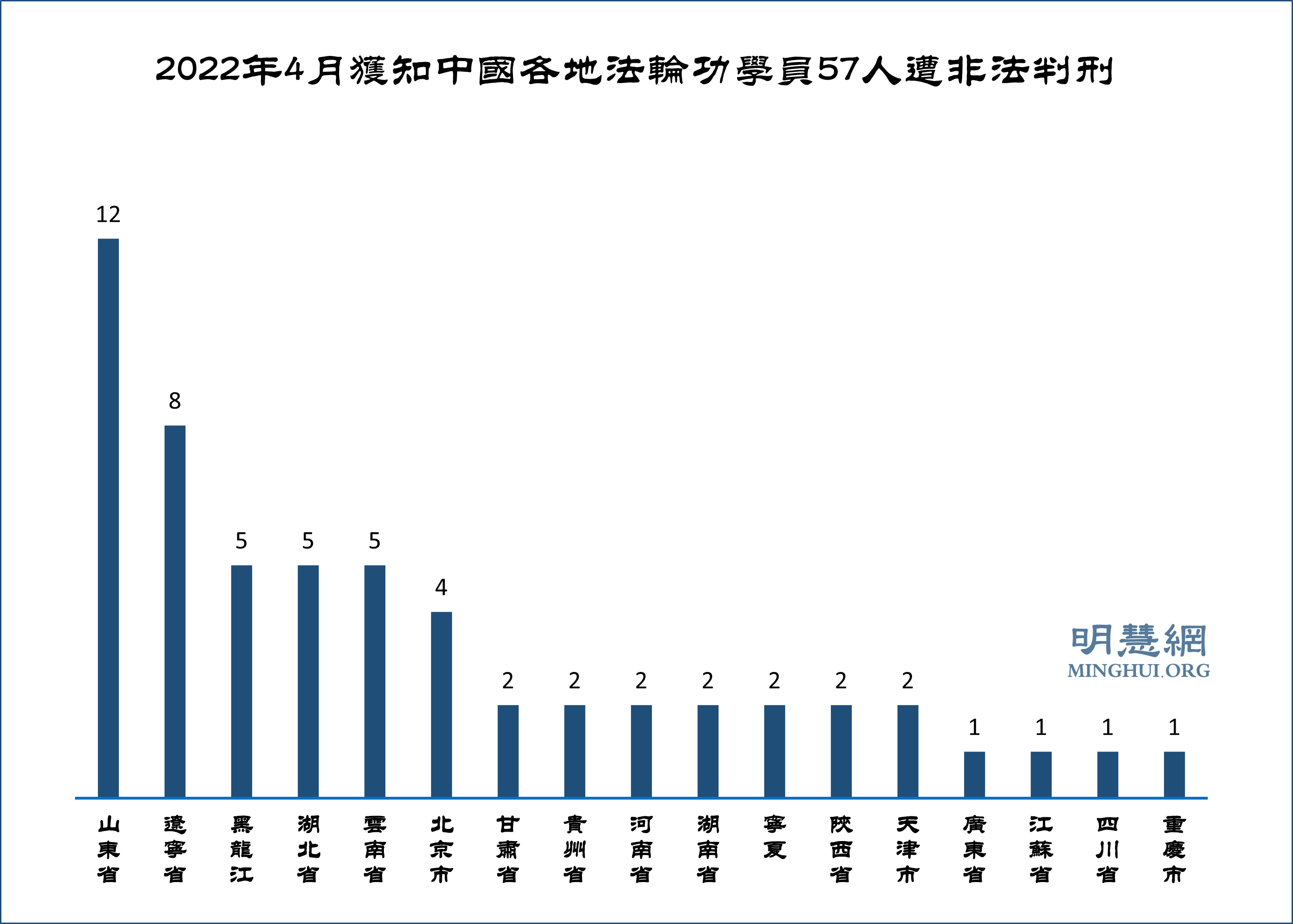 ![]() 图2:2022年4月获知中国各地法轮功学员57人遭非法判刑 |