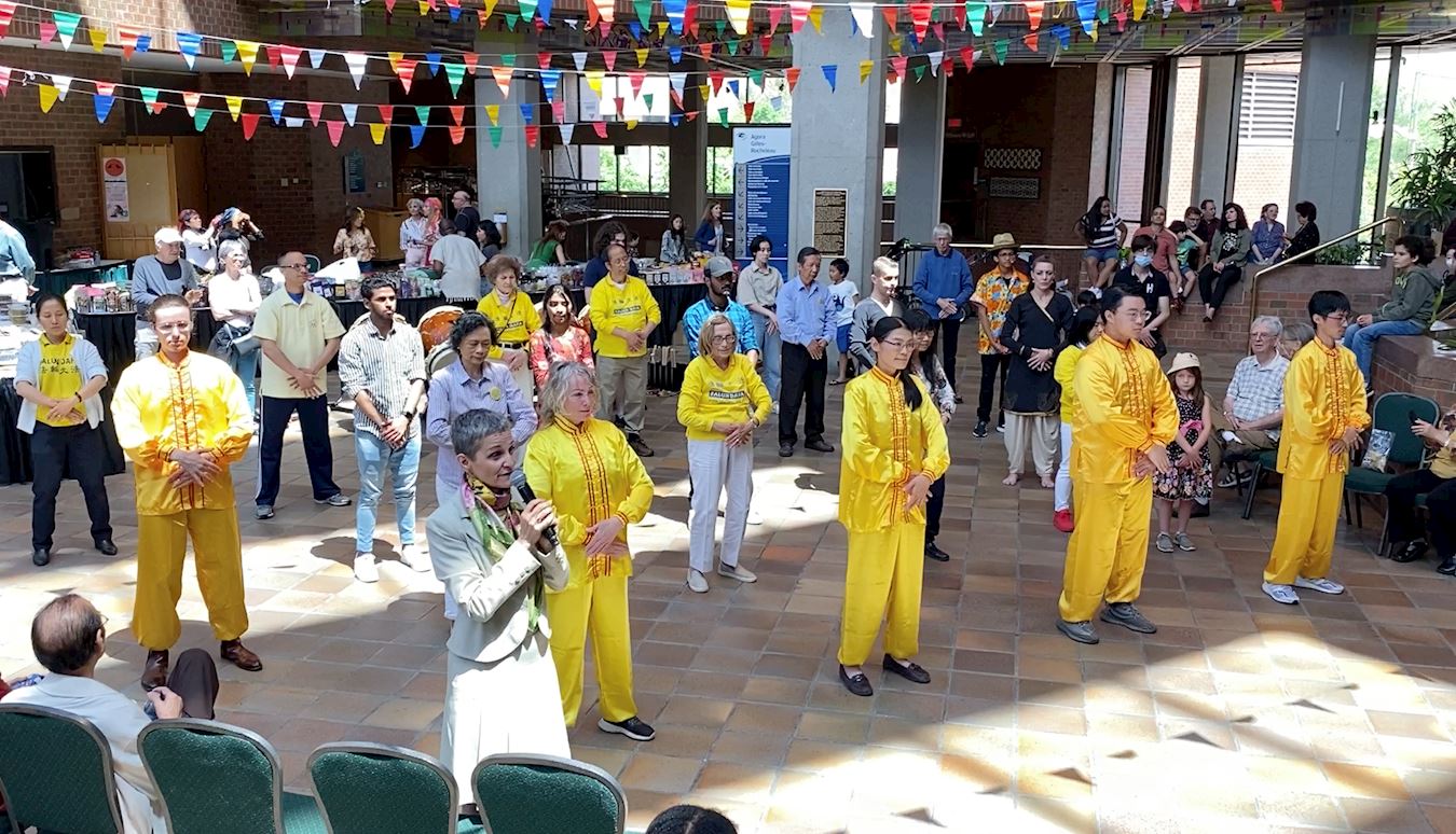 渥太华-加蒂诺地区的法轮功学员受邀展示五套功法。舒缓、平和的炼功动作,让现场的观众纷纷加入其中,一起随着音乐学炼法轮功。