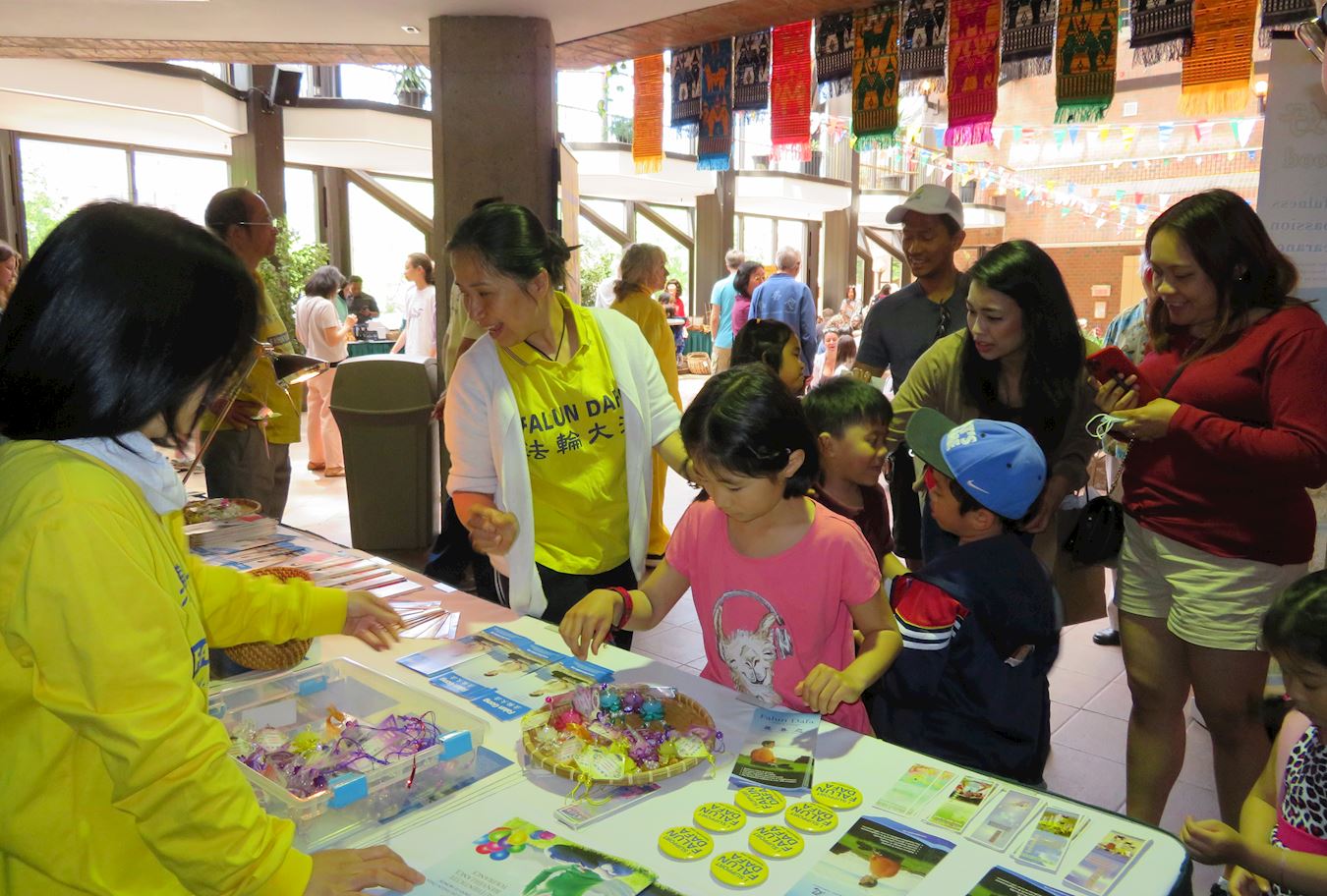 不同族裔的民众纷纷来到法轮功的展位上,希望进一步了解法轮大法。