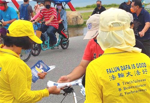 台东国际地标每到周末游客络绎不绝,今年庆祝法轮功弘传世界三十周年,学员向往来的游客递送《明慧周报》,介绍法轮功的美好,许多人欣然接受,倾听真相。有位驻足观看学员炼功的游客,听到法轮功弘传全世界一百多个国家及地区,不禁双手竖起大拇指,大声说:“赞!”