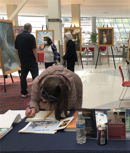 很多观众在呼吁停止迫害的征签表格上签名表示支持,并询问法轮大法的信息。有的人在现场阅读《法轮功》和《转法轮》书籍,有的人表示是画展中展现的信仰,就是他们在其他宗教中失望后所要寻找的精神信仰,并询问当地炼功点讯息并表示要学法轮功。