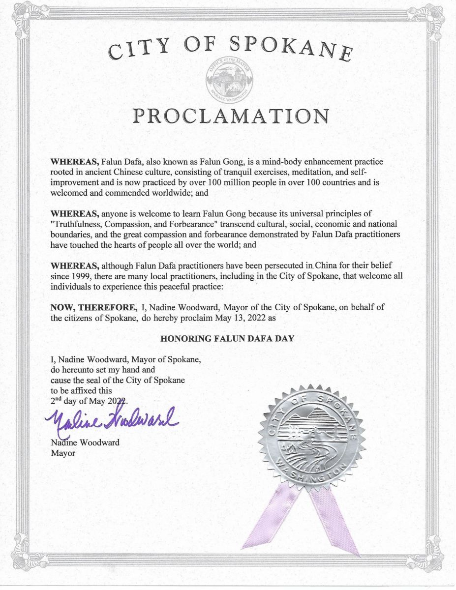 现在,因此,我,斯波坎市市长纳丁·伍德沃德,代表斯波坎市民,特此宣布二零二二年五月十三为“法轮大法日”。