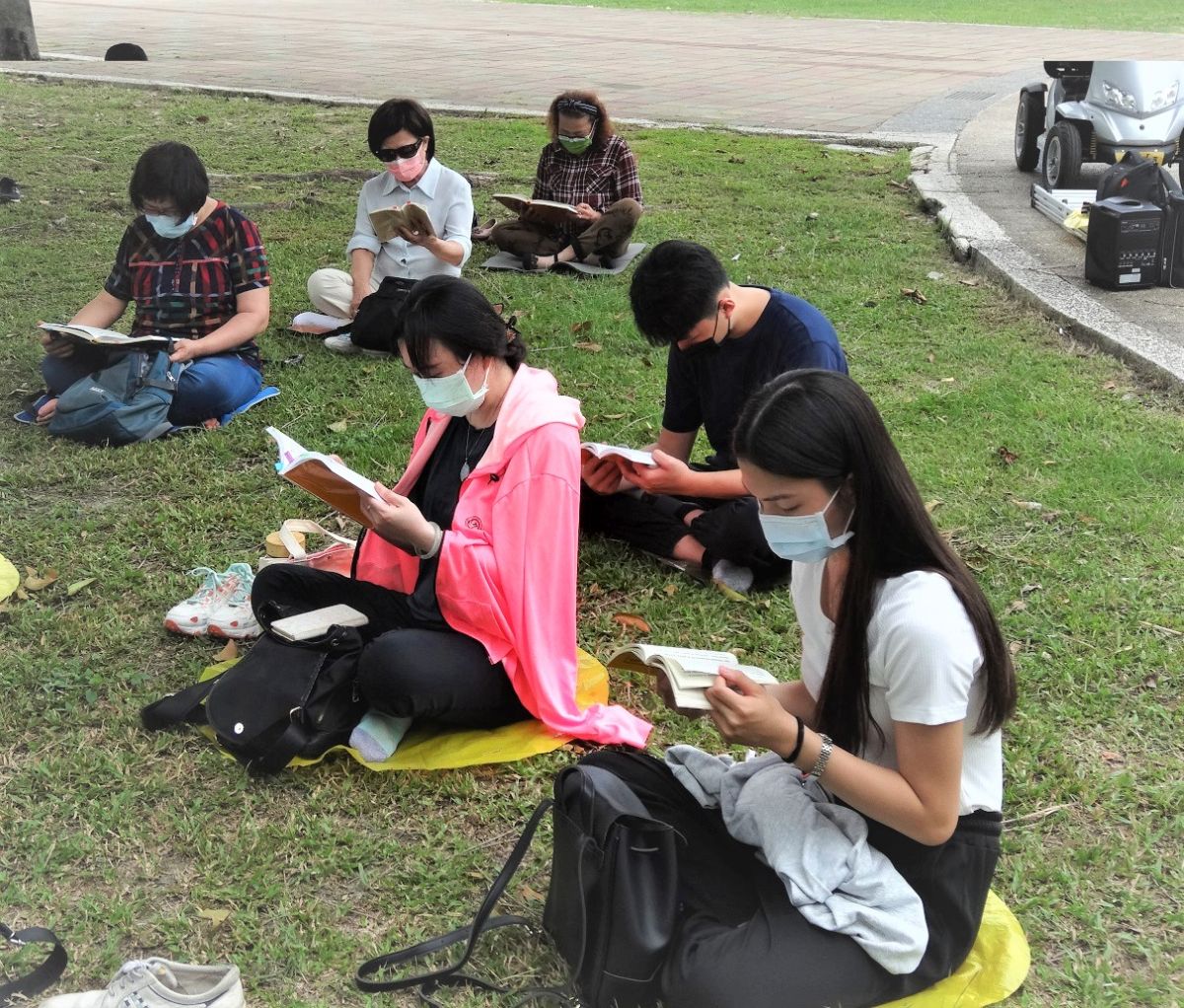 '图4~图6屏东法轮功学员们集体学法,并分享心得交流,在修炼路上比学比修。'