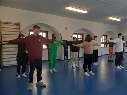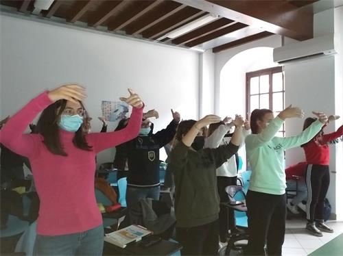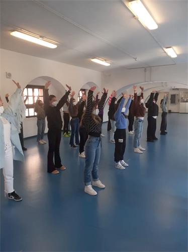 二零二二年开学以来,在中文老师及体育课老师的配合安排下,学校体育课也安排了教授法轮功功法课程,这样不仅中文班学生,其他语言班学生也能在体育课上系统、详尽地学炼法轮功功法。课上学生们都感受到强烈的能量及祥和,宁静的安抚力量。