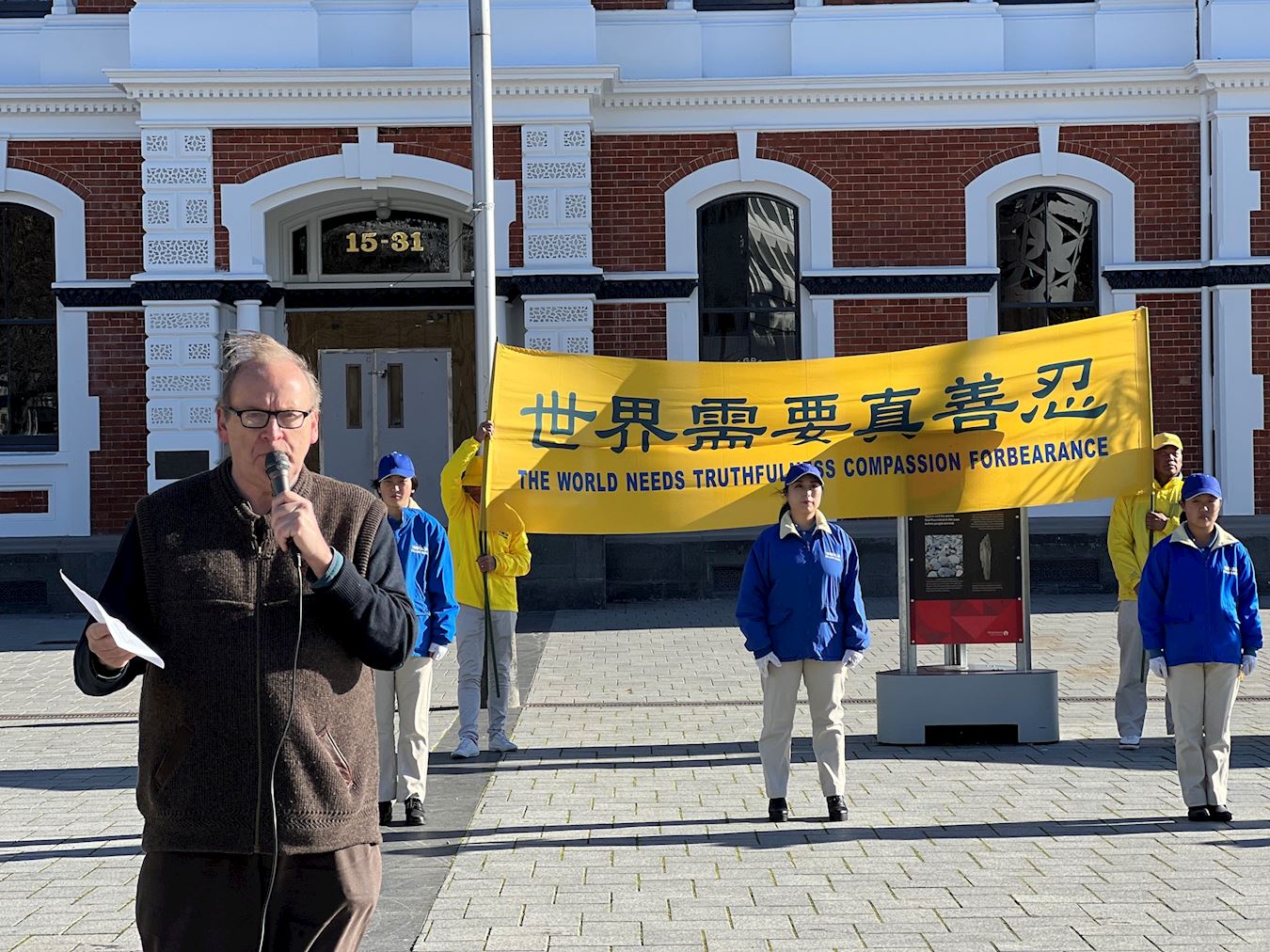 来自基督城教会菲利普·奎迪(Philip Creed)参加了本次集会并发表演讲。他在演讲中,首先向公众介绍了:法轮功是一种古老的修炼方法,通过打坐冥想,使人们身心健康,自一九九二年从中国传出,获得了广泛的支持,在中国有数千万人修炼法轮大法。