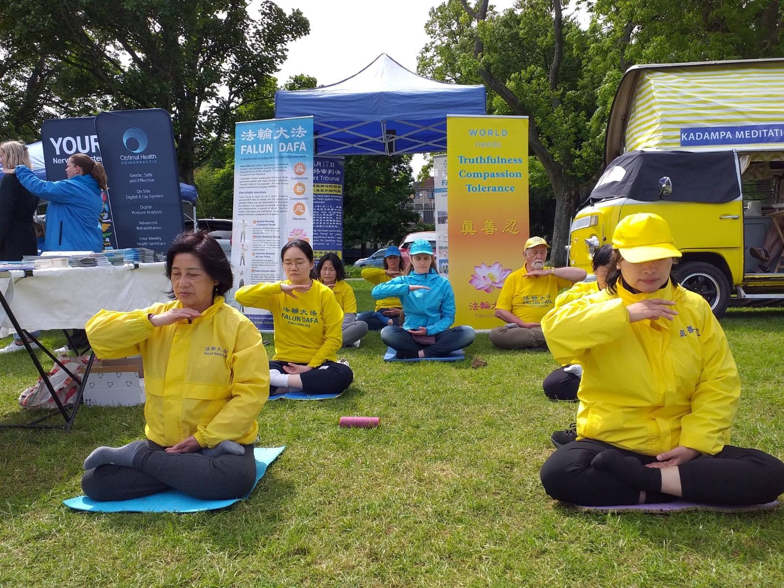 法轮功学员的展位整洁醒目,优美的音乐、祥和的功法,吸引了很多人的目光。