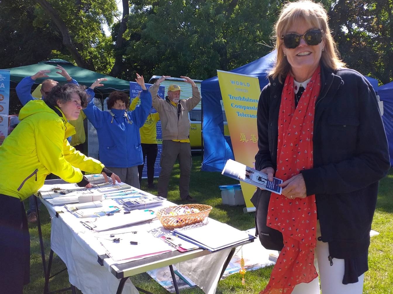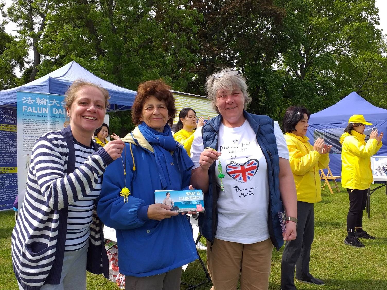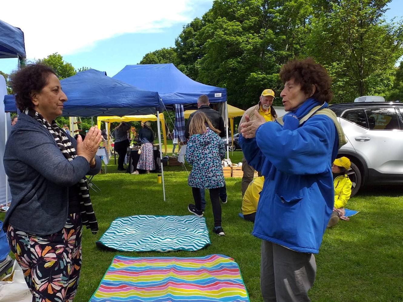 库尔德(Kurdish)女士要求现场学炼功法。于是,法轮功学员罗斯玛丽教了她第一套功法。库尔德女士对女儿说,太好了。她说她的双手和小腹产生很强的热量,十分舒服,她终于找到想要的东西了。