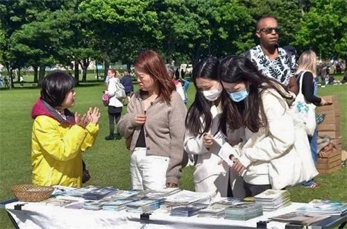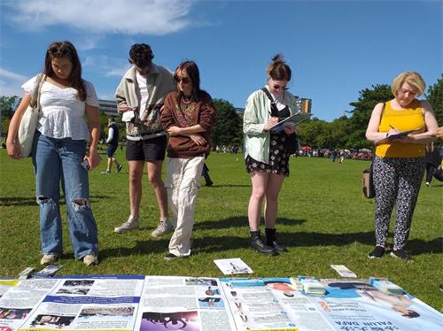 两天来,学员罗斯玛丽一直忙着给有兴趣学炼功法的人介绍爱丁堡炼功点的位置和联系方式。还有很多民众在了解真相后签名支持法轮功学员制止迫害。