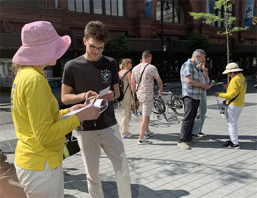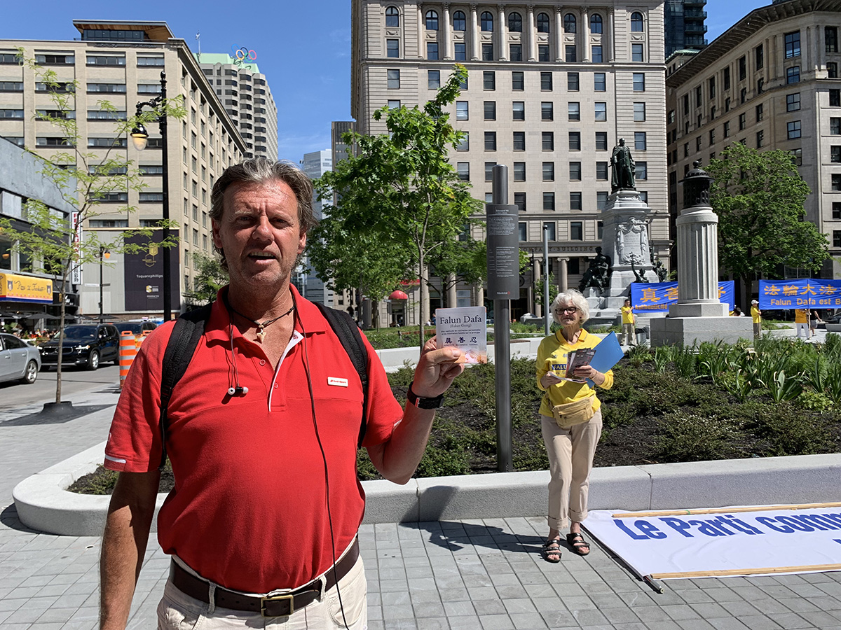 他还说,往年的夏天,常在蒙特利尔市中心看到法轮功学员举办活动,但从未停下来进一步了解。今天他和一位法轮功学员进行了长谈,了解了法轮大法是什么,以及为什么法轮功学员坚持反迫害。他由衷敬佩法轮功学员的正气,说:“真心希望通过你们的努力,能让中国人获得自由”。