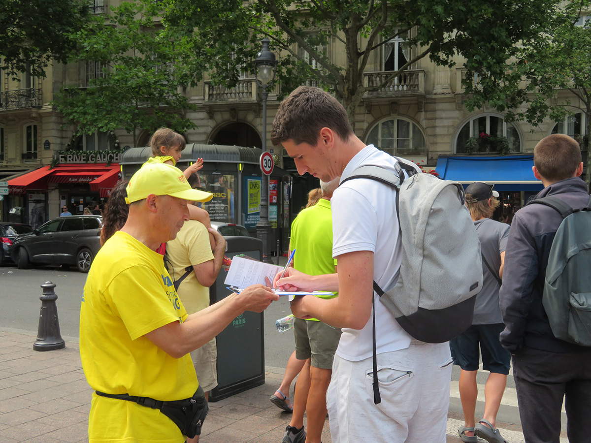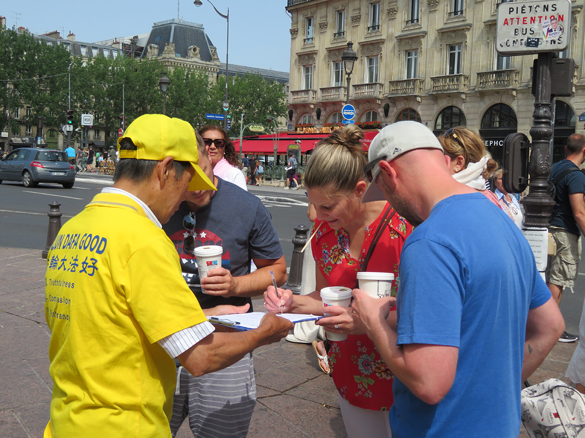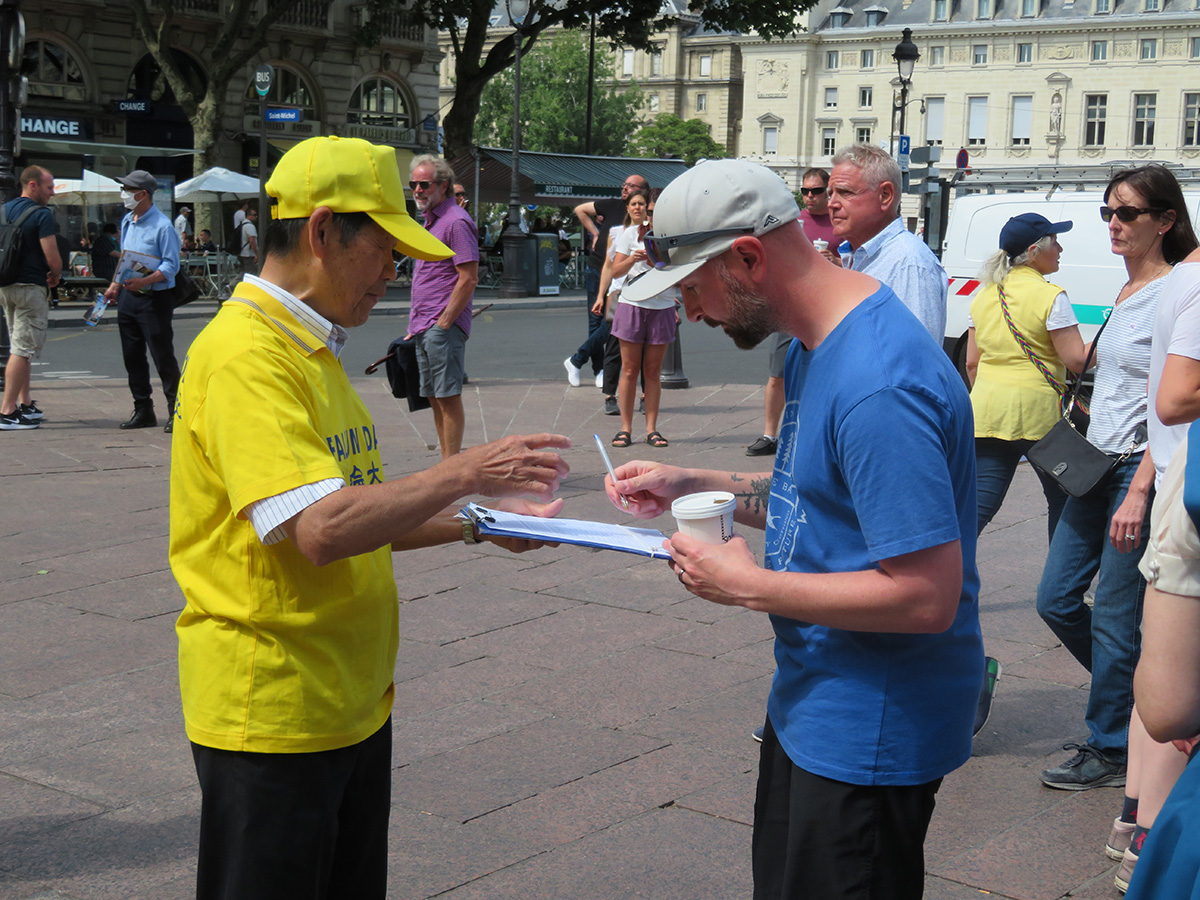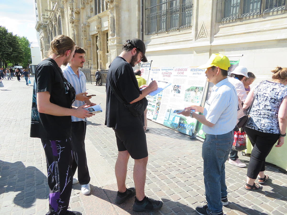 图2~3:二零二二年六月十一日, 在巴黎市中心的夏特蕾街区,游人在征签表上签字,支持法轮功学员反迫害。