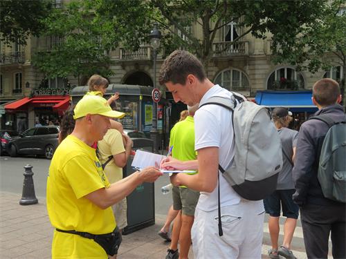 ![]() 图2~3:二零二二年六月十一日, 在巴黎市中心的夏特蕾街区,游人在征签表上签字,支持法轮功学员反迫害。 |
