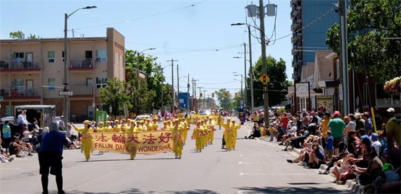 六月十九日,天国乐团和炼功方阵受邀参加了奥沙瓦(Oshawa)的“多元文化节”游行。同时,腰鼓队参加了韦兰(Welland)举行的“玫瑰节”游行。在这两天的游行活动中,法轮大法学员的方阵深受两边观众的喜爱。有很多民众随着天国乐团和腰鼓队的节奏拍手,有些观众学着学员的动作学炼法轮大法的功法。