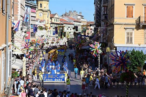 六月十八日,里耶卡市中心的嘉年华游行邀请了由法轮功学员组成的欧洲天国乐团,两百多名法轮功学员组成的天国乐团和游行方阵参加了本次活动,天国乐团是本次嘉年华活动人数最多的乐团。今年的里耶卡嘉年华聚集了五十七个团体,近五千人参加,数以万计的现场观众观看了本次大游行。