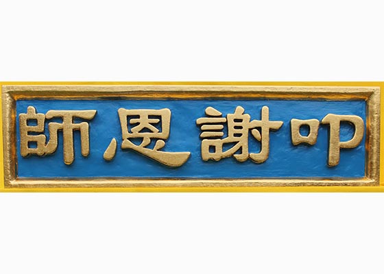 谨以此手工雕刻匾额表达对慈悲伟大的李洪志师父的感恩,感恩师尊慈悲救度,恭贺法轮大法弘传世界三十周年。