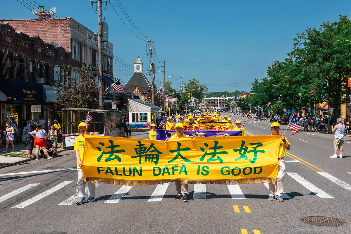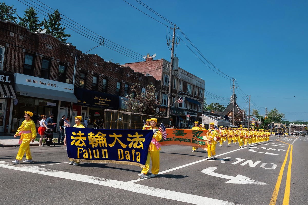 法轮功参加纽约小颈国殇日游行 民众欢迎