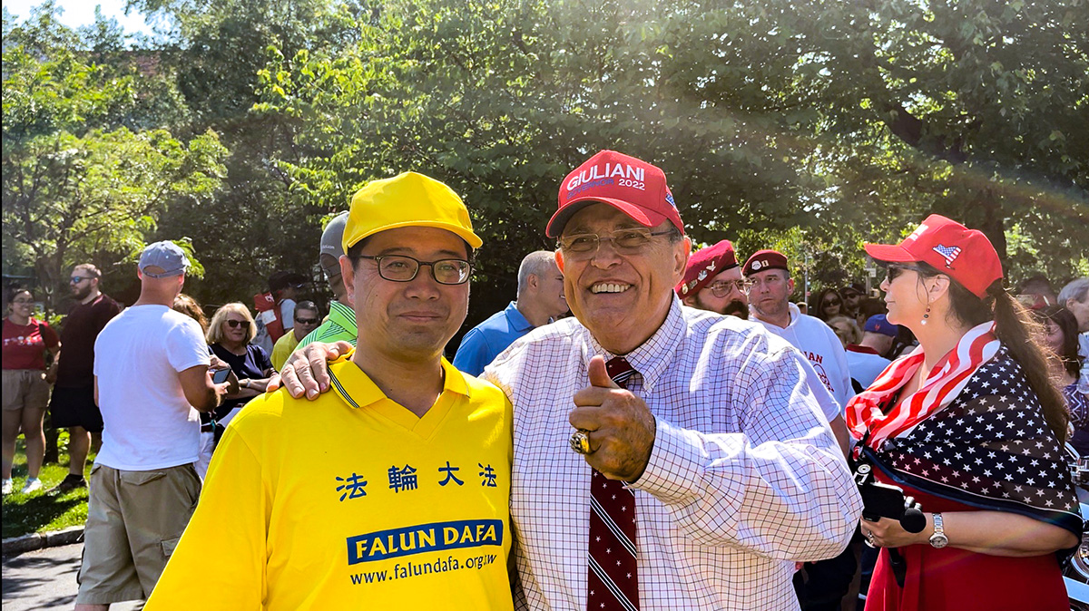 纽约前市长朱利安尼也来到游行现场,和迈克尔(Michael Yu)一起合影,还告诉迈克尔他知道法轮大法,并竖起大拇指。