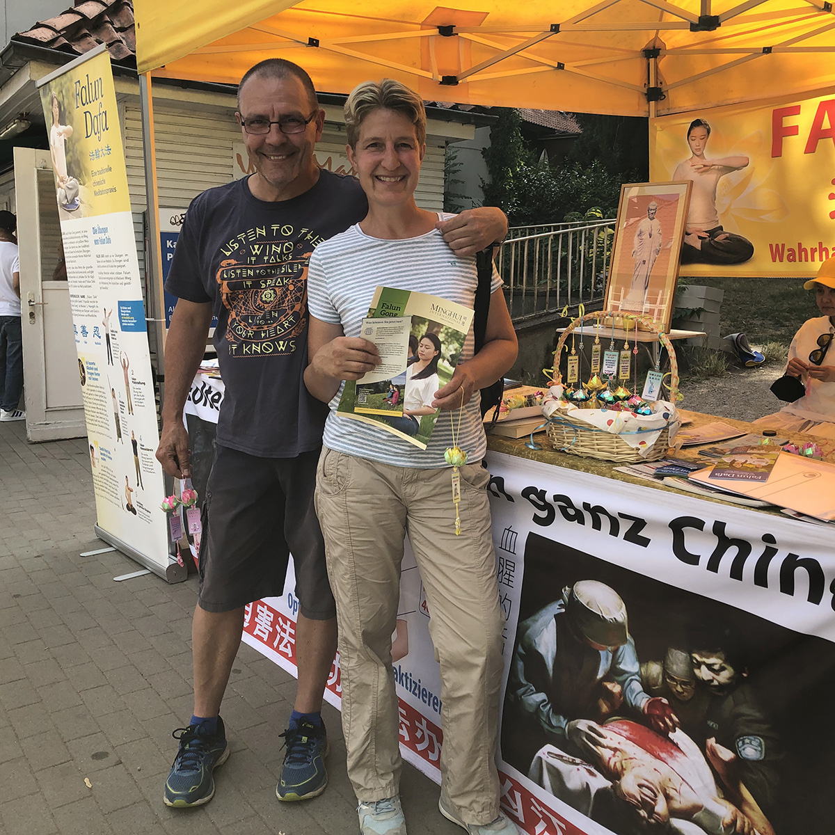 一对来自汉堡的夫妇已经在汉堡得知了关于中共迫害法轮功的信息,他们来到展位前签名。他们对法轮功学员表示,学员所做的这一切都非常好。他们也很高兴拿到学员送的带有真、善、忍字样的小莲花。