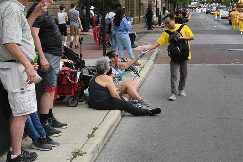 图5~6:跟随游行队伍的法轮功学员向民众发放真相传单并介绍法轮功