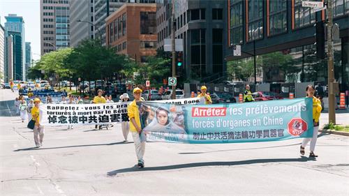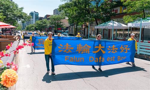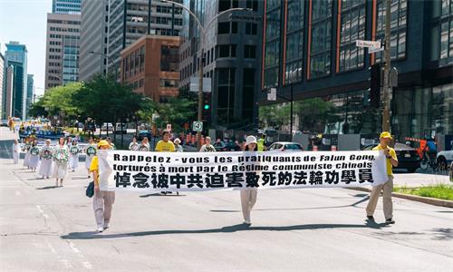 '图1:2022年7月9日,加拿大魁北克部份法轮功学员在蒙特利尔市中心举行反迫害23周年大游行。'